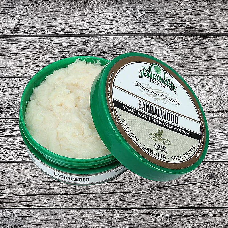 Мыло для бритья Stirling Sandalwood на основе животного жира, ланолина и глицерина обеспечивает отличную пену и безупречное скольжение бритвы.