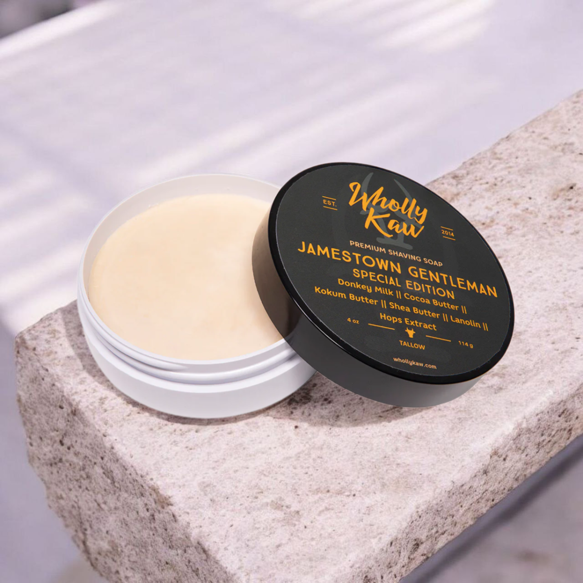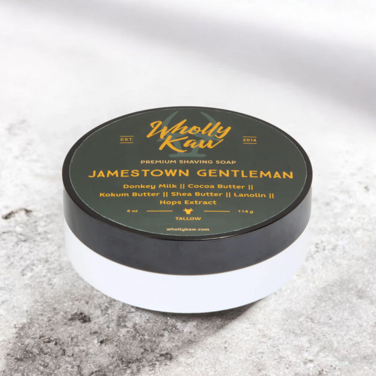 Jamestown Gentleman - мыло для бритья американского ремесленного бренда Wholly Kaw. Образует густую защитную пену. Мужественный аромат со свежими и чистыми нотами бергамота, лаванды и нероли, легкими цветочными оттенками, сладкими пудровыми нотами, мускусом, амброй, ценными породами дерева и нотами цветков табака.