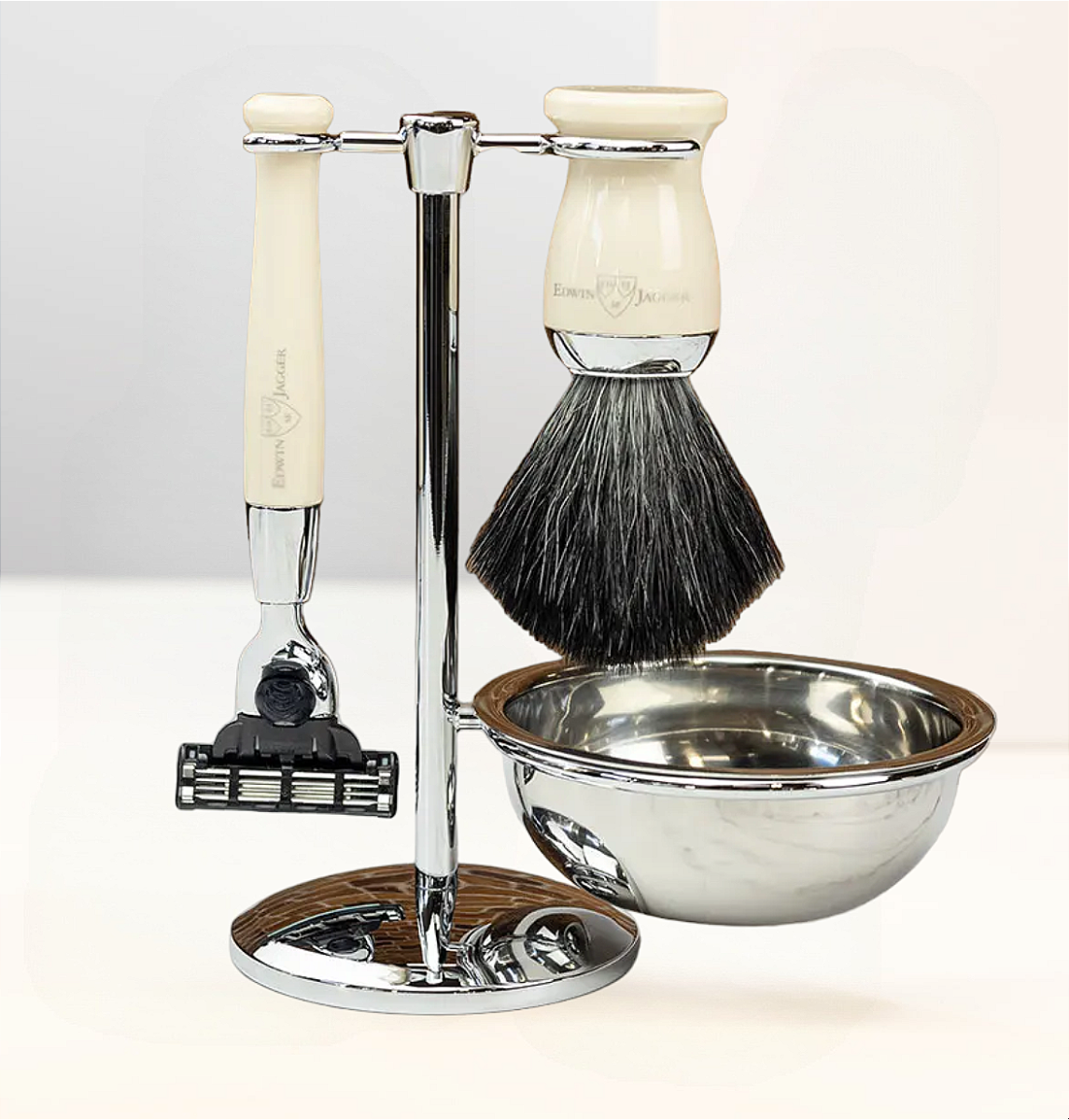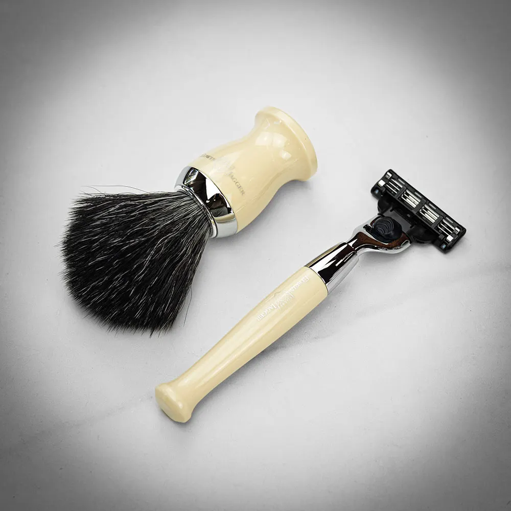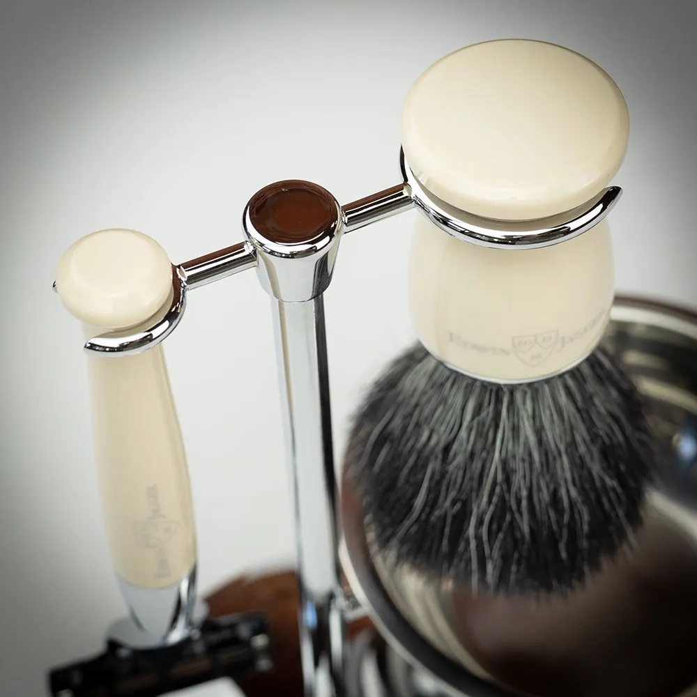 Станок для бритья и помазок от Edwin Jagger изготавливаются из хрома и дополнительно покрыты высокопрочным материалом, отлично имитирующим цвет слоновой кости (айвори).