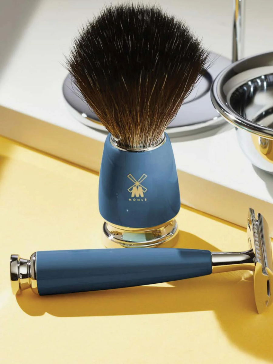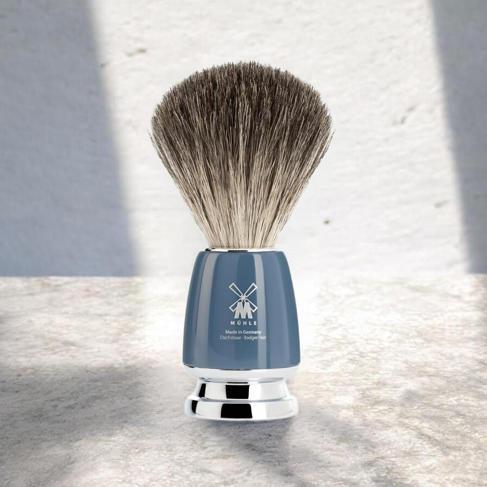 Помазок для бритья Muhle 81M226 серии RYTMO из шерсти барсука категории PURE Badger. Ручка из синтетической смолы светло-синего цвета и хромированной латуни. На ручке нанесен логотип производителя.