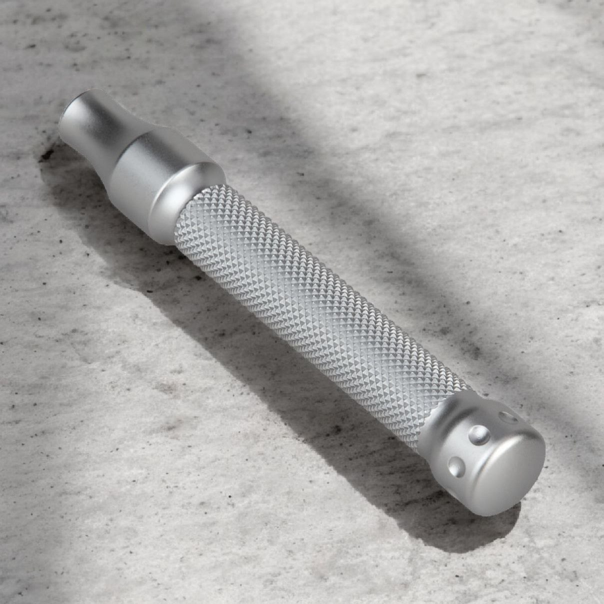 Рукоятка Legione, изготовленная из нержавеющей стали AISI 303, имеет резьбу и совместима со многими трехкомпонентными бритвами от Mühle, Parker, Rockwell, iKON, Edwin Jagger, Kent, Merkur, RazoRock и, конечно же, The Goodfella's Smile. Рукоятка покрыта матовым твердым хромом, что делает ее устойчивой к царапинам и коррозии.