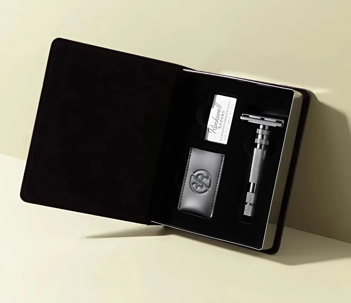 Поставляется с упаковкой фирменных лезвий (5 штук) и чехлом из кожи.